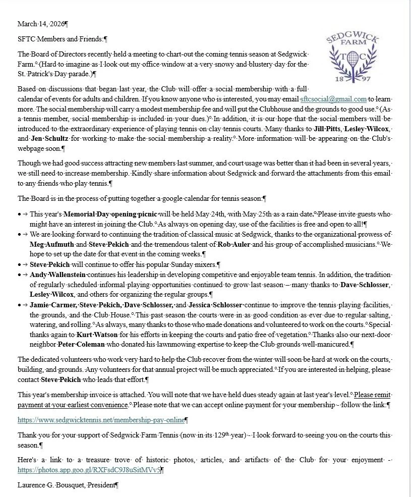 Sedgwick Farm Tennis club was founded in 1897. The club is the only red clay tournament-capable facility between Albany and Buffalo. Its friendly environment welcomes all levels and ages of play to come play, learn and socialize.